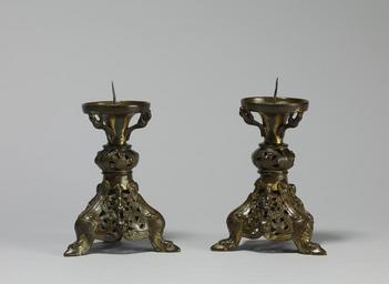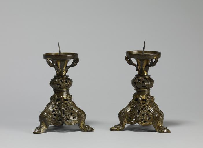 | Keywords: Mosan Workshop - Pair of Altar Candlesticks - Walters 54426, 54427 - Profile.jpg Both of these candlesticks have three feet formed like winged dragons In between them human figures with outstretched arms stand on grotesque heads amidst vine trellises At the top small bird-like creatures support the wax pan The intricate woven style of this candlestick was widely popular in Belgian German and English regions late Other date century 12 Medieval gilt bronze 54 426 H with prong 6 9/16 x W at base 4 1/2 in 16 6 x 11 5 cm ; 54 427 H with prong 6 7/16 x W at base 4 5/8 in 16 3 x 11 8 cm accession number 54 426 54 427 77442 Henri de Lannoy Paris Collection Dietz-Coblenz Henri Daguerre Paris Henry Walters city Baltimore Walters Art Museum Henry Walters Acquired by Henry Walters 1925 place of origin Limoges France Walters Art Museum license Medieval metalwork in the Walters Art Museum Metalwork by Mosan workshops Media contributed by the Walters Art Museum needs category review |
