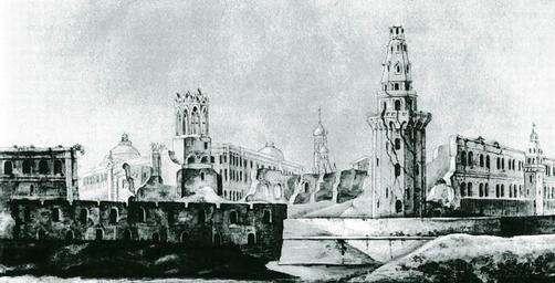 | Keywords: Moscow Kremlin, 1812 damage, A.Bakarev, 1812.jpg en Damage of Moscow Kremlin in 1812 Two towers in the center are Nikolskaya and Arsenalnaya; right behind them are the ruins of Kremlin Arsenal The wall between two towers - completely collapsed Раз ушение К емля в 1812 году икольская башня уины А сенала А сенальная башня Памятники а хитекту ы в до еволюционной России Те а 2002 ISBN 5-275-00664-0 1812 A Bakarev d 1840 PD PD-old-100 Moscow Kremlin destruction of 1812 and restoration Kremlin Arsenal destruction of 1812 and restoration Nikolskaya Tower Uglovaya Arsenalnaya Tower |