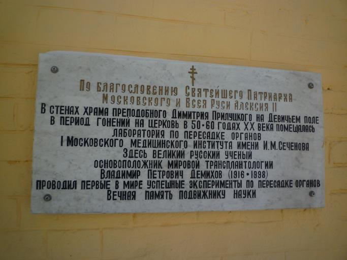 | Keywords: Moscow, St.Demetrios in Devichye Pole Demikhov surgeon memory plate.JPG ru Памятная табличка на ru Це ковь Димит ия П илуцкого на Девичьем поле посвященная деятельности ru Демихов Владими Пет ович 2011-03-04 14 55 24 own Leksey cc-zero Uploaded with UploadWizard Church of Dimitry Prilutsky at Devichye Pole |