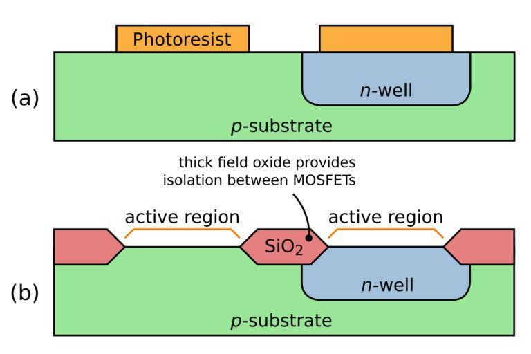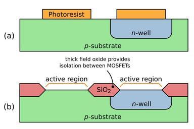 | Keywords: MOSFET Manufacture - 2 - define active regions.svg Complementary metal oxide-semiconductor CMOS manufacture process A cross-section of the manufacture of a CMOS inverter <br> Stage 2 Definition of active regions own 2009-11-16 Inductiveload Own work all rights released Public domain CMOS manufacture |