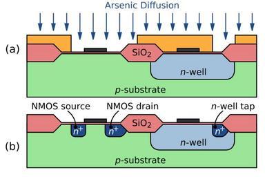 | Keywords: MOSFET Manufacture - 4 - n+ diffusion.svg Complementary metal oxide-semiconductor CMOS manufacture process A cross-section of the manufacture of a CMOS inverter <br> Stage 4 n+ diffusion own 2009-11-16 Inductiveload Own work all rights released Public domain CMOS manufacture |