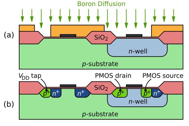 | Keywords: MOSFET Manufacture - 5 - p+ diffusion.svg Complementary metal oxide-semiconductor CMOS manufacture process A cross-section of the manufacture of a CMOS inverter <br> Stage 5 p+ diffusion own 2009-11-16 Inductiveload Own work all rights released Public domain CMOS manufacture |