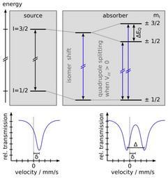 | Keywords: Mossbauer Isomer Shift and Quadrupole Splitting for 57Fe.svg en Isomer Shift and Quadrupole Splitting with iron 57 Energy levels and schematic spectra Naming of quantities according to IUPAC recommendations Pure Appl Chem 1976 Vol 45 pp 211 ”216 2012-11-24 14 17 59 own Joël Gubler cc-zero Uploaded with UploadWizard Spectroscopy |