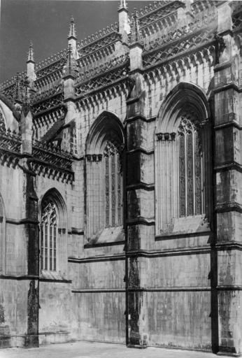 | Keywords: arquitectura gótico portugal batalha mosteiro santa vitória fundação calouste gulbenkian fundaçãocaloustegulbenkian maria pia mariapia mário tavares chicó máriotavareschicó mário novais márionovais gótica biblioteca de arte bibliotecadearte Fachada lateral: pormenor Fotógrafo: Mário Novais, 1899-1967. Orientador científico: Mário Tavares Chicó, 1905-1966. Data aproximada da produção da fotografia original: 1954. O Mosteiro da Batalha é o mais importante símbolo da Dinastia de Avis. Ele foi construído por iniciativa de D. João I, na sequência de um voto à Virgem, caso vencesse a Batalha de Aljubarrota (1385). Ao longo do século XV, praticamente todos os monarcas aqui deixaram a sua marca. O arranque das obras deu-se em 1388 e foi conduzido por Afonso Domingues, que se manteve à frente do estaleiro até 1402, ano em que faleceu. A ele se atribui o plano geral da construção e o grande avanço dos trabalhos na igreja e no claustro. Não terá tido tempo de executar a fachada principal nem o abobadamento do templo, deixando igualmente inacabado o claustro. A magnífica igreja de três naves e transepto saliente por si delineada, com cabeceira de cinco capelas, sendo a central de duplo tramo e terminação poligonal, terá sido o ponto alto da sua carreira, mas revela bem o nível ainda algo arcaizante da arquitectura portuguesa de finais do século XIV, alheia aos progressos do Gótico Flamejante, que tanto iria marcar a segunda fase do monumento. Com efeito, a partir de 1402, a chefia do estaleiro foi entregue a Huguet, arquitecto de provável origem catalã que inaugurou, entre nós, o tardo-gótico. Documentado à frente do projecto até 1438, a ele se deve o abobadamento dos espaços da igreja e da Sala do Capítulo (onde experimentou, pela primeira vez, uma abóbada estrelada), a construção da Capela do Fundador e, ainda, o início das obras das Capelas Imperfeitas, bem como a conclusão da fachada principal, onde sobressai o portal axial. Este, é delimitado por um arco canopial que integra os escudos de D. João I e de D. Filipa. No tímpano, exibe-se Cristo em Majestade ladeado pelos Evangelistas e as arquivoltas são repletas de figurações que continuam pelas estátuas-colunas, ao abrigo de um complexo programa iconográfico. Mas a mais emblemática obra de Huguet é a Capela do Fundador. Ela foi concebida para panteão régio e sabemos que já se encontrava em obras em 1426. É um compartimento quadrangular que se adossa aos três tramos ocidentais da fachada lateral Sul e integra, ao centro, um esquema octogonal de suportes onde descarrega a abóbada estrelada, solução primeiro experimentada em Inglaterra, mas rapidamente difundida pela Europa. No circuito interior desta capela, colocou-se o túmulo duplo de D. João I e de D. Filipa, realização igualmente sem antecedentes no nosso país e que resulta de uma nítida influência da tumulária inglesa. Na capela repousam também os filhos do casal régio (como D. Henrique e o regente D. Pedro), de acordo com a decisão testamentária de D. João I em fazer deste espaço um efectivo panteão. Em 1436, D. Duarte decidiu edificar uma capela funerária para si próprio. O projecto então concebido por Huguet foi o mais arrojado da sua carreira na Batalha, privilegiando uma planta circular que, todavia, não viria a ser concluída pelo falecimento do mestre dois anos depois. Desta forma, e não obstante a intervenção de Mestre Martim Vasques, a construção cessou até ao reinado de D. Manuel e, mesmo nessa altura, não foi concluída, razão de esta parcela ser conhecida como as Capelas Imperfeitas. No reinado de D. Afonso V, edificou-se o segundo claustro do mosteiro. Ele resulta da intervenção do arquitecto Fernão de Évora e, estilisticamente, é uma obra que contraria o tardo-gótico de raiz flamejante, tendo-se optado deliberadamente pela austeridade arquitectónica, que rejeita até a inclusão de capitéis a marcar o arranque dos arcos. A Batalha teve outras fases construtivas igualmente relevantes, como o Manuelino ou o Renascimento. Todavia, a mudança dinástica verificada com D. Manuel privilegiou outros locais e, só no século XIX, o Mosteiro voltou a ser intervencionado, desta vez com o objectivo de restaurar o conjunto, campanha que se prolongou por meio século. (Fonte: IPPAR - tinyurl.com/5dmlfe) [CFT015.153.ic] Fachada lateral: pormenor Fotógrafo: Mário Novais, 1899-1967. Orientador científico: Mário Tavares Chicó, 1905-1966. Data aproximada da produção da fotografia original: 1954. O Mosteiro da Batalha é o mais importante símbolo da Dinastia de Avis. Ele foi construído por iniciativa de D. João I, na sequência de um voto à Virgem, caso vencesse a Batalha de Aljubarrota (1385). Ao longo do século XV, praticamente todos os monarcas aqui deixaram a sua marca. O arranque das obras deu-se em 1388 e foi conduzido por Afonso Domingues, que se manteve à frente do estaleiro até 1402, ano em que faleceu. A ele se atribui o plano geral da construção e o grande avanço dos trabalhos na igreja e no claustro. Não terá tido tempo de executar a fachada principal nem o abobadamento do templo, deixando igualmente inacabado o claustro. A magnífica igreja de três naves e transepto saliente por si delineada, com cabeceira de cinco capelas, sendo a central de duplo tramo e terminação poligonal, terá sido o ponto alto da sua carreira, mas revela bem o nível ainda algo arcaizante da arquitectura portuguesa de finais do século XIV, alheia aos progressos do Gótico Flamejante, que tanto iria marcar a segunda fase do monumento. Com efeito, a partir de 1402, a chefia do estaleiro foi entregue a Huguet, arquitecto de provável origem catalã que inaugurou, entre nós, o tardo-gótico. Documentado à frente do projecto até 1438, a ele se deve o abobadamento dos espaços da igreja e da Sala do Capítulo (onde experimentou, pela primeira vez, uma abóbada estrelada), 