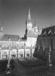 | Keywords: arquitectura gótico portugal batalha mosteiro santa vitória fundação calouste gulbenkian fundaçãocaloustegulbenkian maria pia mariapia mário tavares chicó máriotavareschicó mário novais márionovais gótica biblioteca de arte bibliotecadearte Claustro real Fotógrafo: Mário Novais, 1899-1967. Orientador científico: Mário Tavares Chicó, 1905-1966. Data aproximada da produção da fotografia original: 1954. O Mosteiro da Batalha é o mais importante símbolo da Dinastia de Avis. Ele foi construído por iniciativa de D. João I, na sequência de um voto à Virgem, caso vencesse a Batalha de Aljubarrota (1385). Ao longo do século XV, praticamente todos os monarcas aqui deixaram a sua marca. O arranque das obras deu-se em 1388 e foi conduzido por Afonso Domingues, que se manteve à frente do estaleiro até 1402, ano em que faleceu. A ele se atribui o plano geral da construção e o grande avanço dos trabalhos na igreja e no claustro. Não terá tido tempo de executar a fachada principal nem o abobadamento do templo, deixando igualmente inacabado o claustro. A magnífica igreja de três naves e transepto saliente por si delineada, com cabeceira de cinco capelas, sendo a central de duplo tramo e terminação poligonal, terá sido o ponto alto da sua carreira, mas revela bem o nível ainda algo arcaizante da arquitectura portuguesa de finais do século XIV, alheia aos progressos do Gótico Flamejante, que tanto iria marcar a segunda fase do monumento. Com efeito, a partir de 1402, a chefia do estaleiro foi entregue a Huguet, arquitecto de provável origem catalã que inaugurou, entre nós, o tardo-gótico. Documentado à frente do projecto até 1438, a ele se deve o abobadamento dos espaços da igreja e da Sala do Capítulo (onde experimentou, pela primeira vez, uma abóbada estrelada), a construção da Capela do Fundador e, ainda, o início das obras das Capelas Imperfeitas, bem como a conclusão da fachada principal, onde sobressai o portal axial. Este, é delimitado por um arco canopial que integra os escudos de D. João I e de D. Filipa. No tímpano, exibe-se Cristo em Majestade ladeado pelos Evangelistas e as arquivoltas são repletas de figurações que continuam pelas estátuas-colunas, ao abrigo de um complexo programa iconográfico. Mas a mais emblemática obra de Huguet é a Capela do Fundador. Ela foi concebida para panteão régio e sabemos que já se encontrava em obras em 1426. É um compartimento quadrangular que se adossa aos três tramos ocidentais da fachada lateral Sul e integra, ao centro, um esquema octogonal de suportes onde descarrega a abóbada estrelada, solução primeiro experimentada em Inglaterra, mas rapidamente difundida pela Europa. No circuito interior desta capela, colocou-se o túmulo duplo de D. João I e de D. Filipa, realização igualmente sem antecedentes no nosso país e que resulta de uma nítida influência da tumulária inglesa. Na capela repousam também os filhos do casal régio (como D. Henrique e o regente D. Pedro), de acordo com a decisão testamentária de D. João I em fazer deste espaço um efectivo panteão. Em 1436, D. Duarte decidiu edificar uma capela funerária para si próprio. O projecto então concebido por Huguet foi o mais arrojado da sua carreira na Batalha, privilegiando uma planta circular que, todavia, não viria a ser concluída pelo falecimento do mestre dois anos depois. Desta forma, e não obstante a intervenção de Mestre Martim Vasques, a construção cessou até ao reinado de D. Manuel e, mesmo nessa altura, não foi concluída, razão de esta parcela ser conhecida como as Capelas Imperfeitas. No reinado de D. Afonso V, edificou-se o segundo claustro do mosteiro. Ele resulta da intervenção do arquitecto Fernão de Évora e, estilisticamente, é uma obra que contraria o tardo-gótico de raiz flamejante, tendo-se optado deliberadamente pela austeridade arquitectónica, que rejeita até a inclusão de capitéis a marcar o arranque dos arcos. A Batalha teve outras fases construtivas igualmente relevantes, como o Manuelino ou o Renascimento. Todavia, a mudança dinástica verificada com D. Manuel privilegiou outros locais e, só no século XIX, o Mosteiro voltou a ser intervencionado, desta vez com o objectivo de restaurar o conjunto, campanha que se prolongou por meio século. (Fonte: IPPAR - tinyurl.com/5dmlfe) [CFT015.175.ic] Claustro real Fotógrafo: Mário Novais, 1899-1967. Orientador científico: Mário Tavares Chicó, 1905-1966. Data aproximada da produção da fotografia original: 1954. O Mosteiro da Batalha é o mais importante símbolo da Dinastia de Avis. Ele foi construído por iniciativa de D. João I, na sequência de um voto à Virgem, caso vencesse a Batalha de Aljubarrota (1385). Ao longo do século XV, praticamente todos os monarcas aqui deixaram a sua marca. O arranque das obras deu-se em 1388 e foi conduzido por Afonso Domingues, que se manteve à frente do estaleiro até 1402, ano em que faleceu. A ele se atribui o plano geral da construção e o grande avanço dos trabalhos na igreja e no claustro. Não terá tido tempo de executar a fachada principal nem o abobadamento do templo, deixando igualmente inacabado o claustro. A magnífica igreja de três naves e transepto saliente por si delineada, com cabeceira de cinco capelas, sendo a central de duplo tramo e terminação poligonal, terá sido o ponto alto da sua carreira, mas revela bem o nível ainda algo arcaizante da arquitectura portuguesa de finais do século XIV, alheia aos progressos do Gótico Flamejante, que tanto iria marcar a segunda fase do monumento. Com efeito, a partir de 1402, a chefia do estaleiro foi entregue a Huguet, arquitecto de provável origem catalã que inaugurou, entre nós, o tardo-gótico. Documentado à frente do projecto até 1438, a ele se deve o abobadamento dos espaços da igreja e da Sala do Capítulo (onde experimentou, pela primeira vez, uma abóbada estrelada), a construção da Capela