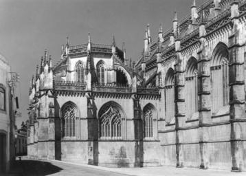 | Keywords: arquitectura gótico portugal batalha mosteiro santa vitória fundação calouste gulbenkian fundaçãocaloustegulbenkian maria pia mariapia religious site religioussite mário tavares chicó máriotavareschicó mário novais márionovais gótica biblioteca de arte bibliotecadearte Capela do Fundador. Fotógrafo: Mário Novais, 1899-1967. Orientador científico: Mário Tavares Chicó, 1905-1966. Data aproximada da produção da fotografia original: 1954. O Mosteiro da Batalha é o mais importante símbolo da Dinastia de Avis. Ele foi construído por iniciativa de D. João I, na sequência de um voto à Virgem, caso vencesse a Batalha de Aljubarrota (1385). Ao longo do século XV, praticamente todos os monarcas aqui deixaram a sua marca. O arranque das obras deu-se em 1388 e foi conduzido por Afonso Domingues, que se manteve à frente do estaleiro até 1402, ano em que faleceu. A ele se atribui o plano geral da construção e o grande avanço dos trabalhos na igreja e no claustro. Não terá tido tempo de executar a fachada principal nem o abobadamento do templo, deixando igualmente inacabado o claustro. A magnífica igreja de três naves e transepto saliente por si delineada, com cabeceira de cinco capelas, sendo a central de duplo tramo e terminação poligonal, terá sido o ponto alto da sua carreira, mas revela bem o nível ainda algo arcaizante da arquitectura portuguesa de finais do século XIV, alheia aos progressos do Gótico Flamejante, que tanto iria marcar a segunda fase do monumento. Com efeito, a partir de 1402, a chefia do estaleiro foi entregue a Huguet, arquitecto de provável origem catalã que inaugurou, entre nós, o tardo-gótico. Documentado à frente do projecto até 1438, a ele se deve o abobadamento dos espaços da igreja e da Sala do Capítulo (onde experimentou, pela primeira vez, uma abóbada estrelada), a construção da Capela do Fundador e, ainda, o início das obras das Capelas Imperfeitas, bem como a conclusão da fachada principal, onde sobressai o portal axial. Este, é delimitado por um arco canopial que integra os escudos de D. João I e de D. Filipa. No tímpano, exibe-se Cristo em Majestade ladeado pelos Evangelistas e as arquivoltas são repletas de figurações que continuam pelas estátuas-colunas, ao abrigo de um complexo programa iconográfico. Mas a mais emblemática obra de Huguet é a Capela do Fundador. Ela foi concebida para panteão régio e sabemos que já se encontrava em obras em 1426. É um compartimento quadrangular que se adossa aos três tramos ocidentais da fachada lateral Sul e integra, ao centro, um esquema octogonal de suportes onde descarrega a abóbada estrelada, solução primeiro experimentada em Inglaterra, mas rapidamente difundida pela Europa. No circuito interior desta capela, colocou-se o túmulo duplo de D. João I e de D. Filipa, realização igualmente sem antecedentes no nosso país e que resulta de uma nítida influência da tumulária inglesa. Na capela repousam também os filhos do casal régio (como D. Henrique e o regente D. Pedro), de acordo com a decisão testamentária de D. João I em fazer deste espaço um efectivo panteão. Em 1436, D. Duarte decidiu edificar uma capela funerária para si próprio. O projecto então concebido por Huguet foi o mais arrojado da sua carreira na Batalha, privilegiando uma planta circular que, todavia, não viria a ser concluída pelo falecimento do mestre dois anos depois. Desta forma, e não obstante a intervenção de Mestre Martim Vasques, a construção cessou até ao reinado de D. Manuel e, mesmo nessa altura, não foi concluída, razão de esta parcela ser conhecida como as Capelas Imperfeitas. No reinado de D. Afonso V, edificou-se o segundo claustro do mosteiro. Ele resulta da intervenção do arquitecto Fernão de Évora e, estilisticamente, é uma obra que contraria o tardo-gótico de raiz flamejante, tendo-se optado deliberadamente pela austeridade arquitectónica, que rejeita até a inclusão de capitéis a marcar o arranque dos arcos. A Batalha teve outras fases construtivas igualmente relevantes, como o Manuelino ou o Renascimento. Todavia, a mudança dinástica verificada com D. Manuel privilegiou outros locais e, só no século XIX, o Mosteiro voltou a ser intervencionado, desta vez com o objectivo de restaurar o conjunto, campanha que se prolongou por meio século. (Fonte: IPPAR - tinyurl.com/5dmlfe) [CFT015.151.ic] Capela do Fundador. Fotógrafo: Mário Novais, 1899-1967. Orientador científico: Mário Tavares Chicó, 1905-1966. Data aproximada da produção da fotografia original: 1954. O Mosteiro da Batalha é o mais importante símbolo da Dinastia de Avis. Ele foi construído por iniciativa de D. João I, na sequência de um voto à Virgem, caso vencesse a Batalha de Aljubarrota (1385). Ao longo do século XV, praticamente todos os monarcas aqui deixaram a sua marca. O arranque das obras deu-se em 1388 e foi conduzido por Afonso Domingues, que se manteve à frente do estaleiro até 1402, ano em que faleceu. A ele se atribui o plano geral da construção e o grande avanço dos trabalhos na igreja e no claustro. Não terá tido tempo de executar a fachada principal nem o abobadamento do templo, deixando igualmente inacabado o claustro. A magnífica igreja de três naves e transepto saliente por si delineada, com cabeceira de cinco capelas, sendo a central de duplo tramo e terminação poligonal, terá sido o ponto alto da sua carreira, mas revela bem o nível ainda algo arcaizante da arquitectura portuguesa de finais do século XIV, alheia aos progressos do Gótico Flamejante, que tanto iria marcar a segunda fase do monumento. Com efeito, a partir de 1402, a chefia do estaleiro foi entregue a Huguet, arquitecto de provável origem catalã que inaugurou, entre nós, o tardo-gótico. Documentado à frente do projecto até 1438, a ele se deve o abobadamento dos espaços da igreja e da Sala do Capítulo (onde experimentou, pela primeira vez, uma abó