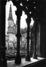 | Keywords: arquitectura gótico portugal batalha mosteiro santa vitória fundação calouste gulbenkian fundaçãocaloustegulbenkian maria pia mariapia monastery cloister garden arch column arches columns trefoil mário tavares chicó máriotavareschicó mário novais márionovais gótica biblioteca de arte bibliotecadearte Claustro real. Fotógrafo: Mário Novais, 1899-1967. Orientador científico: Mário Tavares Chicó, 1905-1966. Data aproximada da produção da fotografia original: 1954. O Mosteiro da Batalha é o mais importante símbolo da Dinastia de Avis. Ele foi construído por iniciativa de D. João I, na sequência de um voto à Virgem, caso vencesse a Batalha de Aljubarrota (1385). Ao longo do século XV, praticamente todos os monarcas aqui deixaram a sua marca. O arranque das obras deu-se em 1388 e foi conduzido por Afonso Domingues, que se manteve à frente do estaleiro até 1402, ano em que faleceu. A ele se atribui o plano geral da construção e o grande avanço dos trabalhos na igreja e no claustro. Não terá tido tempo de executar a fachada principal nem o abobadamento do templo, deixando igualmente inacabado o claustro. A magnífica igreja de três naves e transepto saliente por si delineada, com cabeceira de cinco capelas, sendo a central de duplo tramo e terminação poligonal, terá sido o ponto alto da sua carreira, mas revela bem o nível ainda algo arcaizante da arquitectura portuguesa de finais do século XIV, alheia aos progressos do Gótico Flamejante, que tanto iria marcar a segunda fase do monumento. Com efeito, a partir de 1402, a chefia do estaleiro foi entregue a Huguet, arquitecto de provável origem catalã que inaugurou, entre nós, o tardo-gótico. Documentado à frente do projecto até 1438, a ele se deve o abobadamento dos espaços da igreja e da Sala do Capítulo (onde experimentou, pela primeira vez, uma abóbada estrelada), a construção da Capela do Fundador e, ainda, o início das obras das Capelas Imperfeitas, bem como a conclusão da fachada principal, onde sobressai o portal axial. Este, é delimitado por um arco canopial que integra os escudos de D. João I e de D. Filipa. No tímpano, exibe-se Cristo em Majestade ladeado pelos Evangelistas e as arquivoltas são repletas de figurações que continuam pelas estátuas-colunas, ao abrigo de um complexo programa iconográfico. Mas a mais emblemática obra de Huguet é a Capela do Fundador. Ela foi concebida para panteão régio e sabemos que já se encontrava em obras em 1426. É um compartimento quadrangular que se adossa aos três tramos ocidentais da fachada lateral Sul e integra, ao centro, um esquema octogonal de suportes onde descarrega a abóbada estrelada, solução primeiro experimentada em Inglaterra, mas rapidamente difundida pela Europa. No circuito interior desta capela, colocou-se o túmulo duplo de D. João I e de D. Filipa, realização igualmente sem antecedentes no nosso país e que resulta de uma nítida influência da tumulária inglesa. Na capela repousam também os filhos do casal régio (como D. Henrique e o regente D. Pedro), de acordo com a decisão testamentária de D. João I em fazer deste espaço um efectivo panteão. Em 1436, D. Duarte decidiu edificar uma capela funerária para si próprio. O projecto então concebido por Huguet foi o mais arrojado da sua carreira na Batalha, privilegiando uma planta circular que, todavia, não viria a ser concluída pelo falecimento do mestre dois anos depois. Desta forma, e não obstante a intervenção de Mestre Martim Vasques, a construção cessou até ao reinado de D. Manuel e, mesmo nessa altura, não foi concluída, razão de esta parcela ser conhecida como as Capelas Imperfeitas. No reinado de D. Afonso V, edificou-se o segundo claustro do mosteiro. Ele resulta da intervenção do arquitecto Fernão de Évora e, estilisticamente, é uma obra que contraria o tardo-gótico de raiz flamejante, tendo-se optado deliberadamente pela austeridade arquitectónica, que rejeita até a inclusão de capitéis a marcar o arranque dos arcos. A Batalha teve outras fases construtivas igualmente relevantes, como o Manuelino ou o Renascimento. Todavia, a mudança dinástica verificada com D. Manuel privilegiou outros locais e, só no século XIX, o Mosteiro voltou a ser intervencionado, desta vez com o objectivo de restaurar o conjunto, campanha que se prolongou por meio século. (Fonte: IPPAR - tinyurl.com/5dmlfe) [CFT015.177.ic] Claustro real. Fotógrafo: Mário Novais, 1899-1967. Orientador científico: Mário Tavares Chicó, 1905-1966. Data aproximada da produção da fotografia original: 1954. O Mosteiro da Batalha é o mais importante símbolo da Dinastia de Avis. Ele foi construído por iniciativa de D. João I, na sequência de um voto à Virgem, caso vencesse a Batalha de Aljubarrota (1385). Ao longo do século XV, praticamente todos os monarcas aqui deixaram a sua marca. O arranque das obras deu-se em 1388 e foi conduzido por Afonso Domingues, que se manteve à frente do estaleiro até 1402, ano em que faleceu. A ele se atribui o plano geral da construção e o grande avanço dos trabalhos na igreja e no claustro. Não terá tido tempo de executar a fachada principal nem o abobadamento do templo, deixando igualmente inacabado o claustro. A magnífica igreja de três naves e transepto saliente por si delineada, com cabeceira de cinco capelas, sendo a central de duplo tramo e terminação poligonal, terá sido o ponto alto da sua carreira, mas revela bem o nível ainda algo arcaizante da arquitectura portuguesa de finais do século XIV, alheia aos progressos do Gótico Flamejante, que tanto iria marcar a segunda fase do monumento. Com efeito, a partir de 1402, a chefia do estaleiro foi entregue a Huguet, arquitecto de provável origem catalã que inaugurou, entre nós, o tardo-gótico. Documentado à frente do projecto até 1438, a ele se deve o abobadamento dos espaços da igreja e da Sala do Capítulo (onde experimentou, pela 