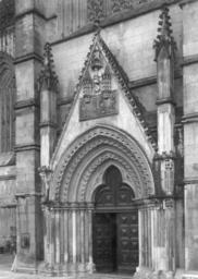 Keywords: arquitectura gótico portugal batalha mosteiro santa vitória fundação calouste gulbenkian fundaçãocaloustegulbenkian maria pia mariapia mário tavares chicó máriotavareschicó mário novais márionovais gótica biblioteca de arte bibliotecadearte Portal do transepto Fotógrafo: Mário Novais, 1899-1967. Orientador científico: Mário Tavares Chicó, 1905-1966. Data aproximada da produção da fotografia original: 1954. O Mosteiro da Batalha é o mais importante símbolo da Dinastia de Avis. Ele foi construído por iniciativa de D. João I, na sequência de um voto à Virgem, caso vencesse a Batalha de Aljubarrota (1385). Ao longo do século XV, praticamente todos os monarcas aqui deixaram a sua marca. O arranque das obras deu-se em 1388 e foi conduzido por Afonso Domingues, que se manteve à frente do estaleiro até 1402, ano em que faleceu. A ele se atribui o plano geral da construção e o grande avanço dos trabalhos na igreja e no claustro. Não terá tido tempo de executar a fachada principal nem o abobadamento do templo, deixando igualmente inacabado o claustro. A magnífica igreja de três naves e transepto saliente por si delineada, com cabeceira de cinco capelas, sendo a central de duplo tramo e terminação poligonal, terá sido o ponto alto da sua carreira, mas revela bem o nível ainda algo arcaizante da arquitectura portuguesa de finais do século XIV, alheia aos progressos do Gótico Flamejante, que tanto iria marcar a segunda fase do monumento. Com efeito, a partir de 1402, a chefia do estaleiro foi entregue a Huguet, arquitecto de provável origem catalã que inaugurou, entre nós, o tardo-gótico. Documentado à frente do projecto até 1438, a ele se deve o abobadamento dos espaços da igreja e da Sala do Capítulo (onde experimentou, pela primeira vez, uma abóbada estrelada), a construção da Capela do Fundador e, ainda, o início das obras das Capelas Imperfeitas, bem como a conclusão da fachada principal, onde sobressai o portal axial. Este, é delimitado por um arco canopial que integra os escudos de D. João I e de D. Filipa. No tímpano, exibe-se Cristo em Majestade ladeado pelos Evangelistas e as arquivoltas são repletas de figurações que continuam pelas estátuas-colunas, ao abrigo de um complexo programa iconográfico. Mas a mais emblemática obra de Huguet é a Capela do Fundador. Ela foi concebida para panteão régio e sabemos que já se encontrava em obras em 1426. É um compartimento quadrangular que se adossa aos três tramos ocidentais da fachada lateral Sul e integra, ao centro, um esquema octogonal de suportes onde descarrega a abóbada estrelada, solução primeiro experimentada em Inglaterra, mas rapidamente difundida pela Europa. No circuito interior desta capela, colocou-se o túmulo duplo de D. João I e de D. Filipa, realização igualmente sem antecedentes no nosso país e que resulta de uma nítida influência da tumulária inglesa. Na capela repousam também os filhos do casal régio (como D. Henrique e o regente D. Pedro), de acordo com a decisão testamentária de D. João I em fazer deste espaço um efectivo panteão. Em 1436, D. Duarte decidiu edificar uma capela funerária para si próprio. O projecto então concebido por Huguet foi o mais arrojado da sua carreira na Batalha, privilegiando uma planta circular que, todavia, não viria a ser concluída pelo falecimento do mestre dois anos depois. Desta forma, e não obstante a intervenção de Mestre Martim Vasques, a construção cessou até ao reinado de D. Manuel e, mesmo nessa altura, não foi concluída, razão de esta parcela ser conhecida como as Capelas Imperfeitas. No reinado de D. Afonso V, edificou-se o segundo claustro do mosteiro. Ele resulta da intervenção do arquitecto Fernão de Évora e, estilisticamente, é uma obra que contraria o tardo-gótico de raiz flamejante, tendo-se optado deliberadamente pela austeridade arquitectónica, que rejeita até a inclusão de capitéis a marcar o arranque dos arcos. A Batalha teve outras fases construtivas igualmente relevantes, como o Manuelino ou o Renascimento. Todavia, a mudança dinástica verificada com D. Manuel privilegiou outros locais e, só no século XIX, o Mosteiro voltou a ser intervencionado, desta vez com o objectivo de restaurar o conjunto, campanha que se prolongou por meio século. (Fonte: IPPAR - tinyurl.com/5dmlfe) [CFT015.150.ic] Portal do transepto Fotógrafo: Mário Novais, 1899-1967. Orientador científico: Mário Tavares Chicó, 1905-1966. Data aproximada da produção da fotografia original: 1954. O Mosteiro da Batalha é o mais importante símbolo da Dinastia de Avis. Ele foi construído por iniciativa de D. João I, na sequência de um voto à Virgem, caso vencesse a Batalha de Aljubarrota (1385). Ao longo do século XV, praticamente todos os monarcas aqui deixaram a sua marca. O arranque das obras deu-se em 1388 e foi conduzido por Afonso Domingues, que se manteve à frente do estaleiro até 1402, ano em que faleceu. A ele se atribui o plano geral da construção e o grande avanço dos trabalhos na igreja e no claustro. Não terá tido tempo de executar a fachada principal nem o abobadamento do templo, deixando igualmente inacabado o claustro. A magnífica igreja de três naves e transepto saliente por si delineada, com cabeceira de cinco capelas, sendo a central de duplo tramo e terminação poligonal, terá sido o ponto alto da sua carreira, mas revela bem o nível ainda algo arcaizante da arquitectura portuguesa de finais do século XIV, alheia aos progressos do Gótico Flamejante, que tanto iria marcar a segunda fase do monumento. Com efeito, a partir de 1402, a chefia do estaleiro foi entregue a Huguet, arquitecto de provável origem catalã que inaugurou, entre nós, o tardo-gótico. Documentado à frente do projecto até 1438, a ele se deve o abobadamento dos espaços da igreja e da Sala do Capítulo (onde experimentou, pela primeira vez, uma abóbada estrelada), a construção