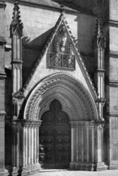Keywords: arquitectura gótico portugal batalha mosteiro santa vitória fundação calouste gulbenkian fundaçãocaloustegulbenkian maria pia mariapia mário tavares chicó máriotavareschicó mário novais márionovais gótica biblioteca de arte bibliotecadearte Portal do transepto Fotógrafo: Mário Novais, 1899-1967. Orientador científico: Mário Tavares Chicó, 1905-1966. Data aproximada da produção da fotografia original: 1954. O Mosteiro da Batalha é o mais importante símbolo da Dinastia de Avis. Ele foi construído por iniciativa de D. João I, na sequência de um voto à Virgem, caso vencesse a Batalha de Aljubarrota (1385). Ao longo do século XV, praticamente todos os monarcas aqui deixaram a sua marca. O arranque das obras deu-se em 1388 e foi conduzido por Afonso Domingues, que se manteve à frente do estaleiro até 1402, ano em que faleceu. A ele se atribui o plano geral da construção e o grande avanço dos trabalhos na igreja e no claustro. Não terá tido tempo de executar a fachada principal nem o abobadamento do templo, deixando igualmente inacabado o claustro. A magnífica igreja de três naves e transepto saliente por si delineada, com cabeceira de cinco capelas, sendo a central de duplo tramo e terminação poligonal, terá sido o ponto alto da sua carreira, mas revela bem o nível ainda algo arcaizante da arquitectura portuguesa de finais do século XIV, alheia aos progressos do Gótico Flamejante, que tanto iria marcar a segunda fase do monumento. Com efeito, a partir de 1402, a chefia do estaleiro foi entregue a Huguet, arquitecto de provável origem catalã que inaugurou, entre nós, o tardo-gótico. Documentado à frente do projecto até 1438, a ele se deve o abobadamento dos espaços da igreja e da Sala do Capítulo (onde experimentou, pela primeira vez, uma abóbada estrelada), a construção da Capela do Fundador e, ainda, o início das obras das Capelas Imperfeitas, bem como a conclusão da fachada principal, onde sobressai o portal axial. Este, é delimitado por um arco canopial que integra os escudos de D. João I e de D. Filipa. No tímpano, exibe-se Cristo em Majestade ladeado pelos Evangelistas e as arquivoltas são repletas de figurações que continuam pelas estátuas-colunas, ao abrigo de um complexo programa iconográfico. Mas a mais emblemática obra de Huguet é a Capela do Fundador. Ela foi concebida para panteão régio e sabemos que já se encontrava em obras em 1426. É um compartimento quadrangular que se adossa aos três tramos ocidentais da fachada lateral Sul e integra, ao centro, um esquema octogonal de suportes onde descarrega a abóbada estrelada, solução primeiro experimentada em Inglaterra, mas rapidamente difundida pela Europa. No circuito interior desta capela, colocou-se o túmulo duplo de D. João I e de D. Filipa, realização igualmente sem antecedentes no nosso país e que resulta de uma nítida influência da tumulária inglesa. Na capela repousam também os filhos do casal régio (como D. Henrique e o regente D. Pedro), de acordo com a decisão testamentária de D. João I em fazer deste espaço um efectivo panteão. Em 1436, D. Duarte decidiu edificar uma capela funerária para si próprio. O projecto então concebido por Huguet foi o mais arrojado da sua carreira na Batalha, privilegiando uma planta circular que, todavia, não viria a ser concluída pelo falecimento do mestre dois anos depois. Desta forma, e não obstante a intervenção de Mestre Martim Vasques, a construção cessou até ao reinado de D. Manuel e, mesmo nessa altura, não foi concluída, razão de esta parcela ser conhecida como as Capelas Imperfeitas. No reinado de D. Afonso V, edificou-se o segundo claustro do mosteiro. Ele resulta da intervenção do arquitecto Fernão de Évora e, estilisticamente, é uma obra que contraria o tardo-gótico de raiz flamejante, tendo-se optado deliberadamente pela austeridade arquitectónica, que rejeita até a inclusão de capitéis a marcar o arranque dos arcos. A Batalha teve outras fases construtivas igualmente relevantes, como o Manuelino ou o Renascimento. Todavia, a mudança dinástica verificada com D. Manuel privilegiou outros locais e, só no século XIX, o Mosteiro voltou a ser intervencionado, desta vez com o objectivo de restaurar o conjunto, campanha que se prolongou por meio século. (Fonte: IPPAR - tinyurl.com/5dmlfe) [CFT015.190.ic] Portal do transepto Fotógrafo: Mário Novais, 1899-1967. Orientador científico: Mário Tavares Chicó, 1905-1966. Data aproximada da produção da fotografia original: 1954. O Mosteiro da Batalha é o mais importante símbolo da Dinastia de Avis. Ele foi construído por iniciativa de D. João I, na sequência de um voto à Virgem, caso vencesse a Batalha de Aljubarrota (1385). Ao longo do século XV, praticamente todos os monarcas aqui deixaram a sua marca. O arranque das obras deu-se em 1388 e foi conduzido por Afonso Domingues, que se manteve à frente do estaleiro até 1402, ano em que faleceu. A ele se atribui o plano geral da construção e o grande avanço dos trabalhos na igreja e no claustro. Não terá tido tempo de executar a fachada principal nem o abobadamento do templo, deixando igualmente inacabado o claustro. A magnífica igreja de três naves e transepto saliente por si delineada, com cabeceira de cinco capelas, sendo a central de duplo tramo e terminação poligonal, terá sido o ponto alto da sua carreira, mas revela bem o nível ainda algo arcaizante da arquitectura portuguesa de finais do século XIV, alheia aos progressos do Gótico Flamejante, que tanto iria marcar a segunda fase do monumento. Com efeito, a partir de 1402, a chefia do estaleiro foi entregue a Huguet, arquitecto de provável origem catalã que inaugurou, entre nós, o tardo-gótico. Documentado à frente do projecto até 1438, a ele se deve o abobadamento dos espaços da igreja e da Sala do Capítulo (onde experimentou, pela primeira vez, uma abóbada estrelada), a construção