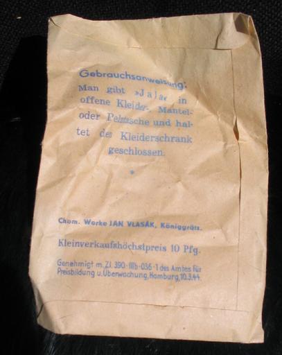 | Keywords: Moth paper-bag Jala Chemische Werke Königgrätz 2.jpg Moth paper-bag against damage caused by moth; Germany Jala vernichtet die Motten samt Brut Gebrauchsanweisung Man gibt Jala in offene Kleider- Mantel- oder Pelztasche und haltet den Kleiderschrank geschlossen Chem Werke JAN VLASAK Königgrätz Genehmigt Zi 390 IIIB-036-1 des Amtes für Preisbildung und à berwachung Hamburg 10 3 44 Aus einem Muffkarton siehe hier Die Beutel sind in der Zeit Ende oder nach 2 Weltkrieg beigelegt worden <br /> Darin befand sich außerdem ein im Leder zerfallener nicht durch Motten zerfressener Skunkskaninmuff Kollektion Kuhn Düsseldorf own collection 1943 or later Kürschner <span class signature-talk >talk</span> 08 56 30 May 2010 UTC de German Wikipedia 1 thumb Moth traps Insect repellents Poisons Furrier's collection Kuhn Products of Hradec Králové History of Hradec Králové |