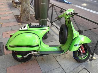 Keywords: moto scooter green old restored motorcycle street sidewalk