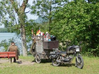 Keywords: motorcycle oldtimer trailers provisions stock break resting on lake bank individual traveller