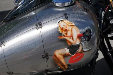 Keywords: motorcycle vehicle two wheeled vehicle refuel tank stock sex symbol sexy woman pinup girl naked model blond clean kiss clean up