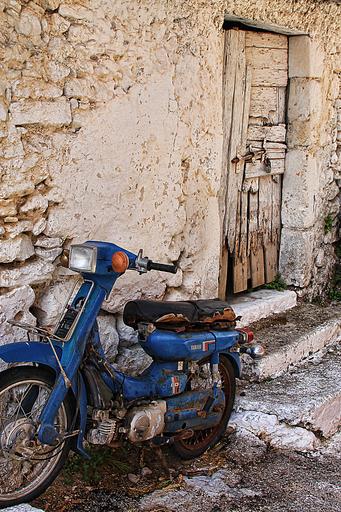 Keywords: motorcycle wall old lapsed wreck old town door spotlight greece oldtimer vehicle