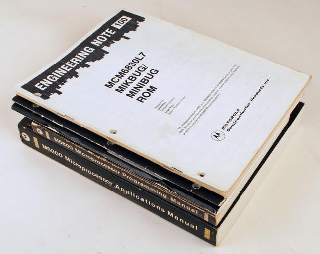Keywords: Motorola M6800 manuals.jpg en Motorola provided a comprehensive set of documentation for the M6800 Microcomputer System MC6800 referred to the microprocessor chip M6800 referred to the whole system including peripheral chips From top to bottom MIKBUG Engineering Note 100 1975 M6800 Microcomputer System Design Data 1976 M6800 System Reference and Data Sheets 1975 M6800 Programming Reference Manual 1976 M6800 Microprocessor Applications Manual 1975 The Microprocessor Applications Manual had 714 pages and describes how to build a point-of-sale terminal that has a bar code reader a printer a keyboard a display and a floppy disk Hardware schematics and software code is provided Own Swtpc6800 en User Swtpc6800 Michael Holley 2010-10-03 Motorola did not as a practice copyright engineering notes or bulletins The Engineering Note 100 did not have a copyright notice and is public domain The MIKBUG ROMs did not have a copyright notice either PD-US-no notice Motorola M6800 Photographs by User Swtpc6800 Point of sale software |