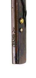 | Keywords: Motoshige - Kozuka with Daikoku's Hammer - Walters 51633 - Mark A.jpg The hammer in the middle of this kozuka belongs to Daikoku one of the seven gods of good fortune Rats are also associated with Daikoku This design has one rat on either side of the hammer The small round objects at the lower right are sacred jewels Most of Daikoku's attributes are derived from Shinto sources but the sacred jewels come from Buddhism Like the other gods of good fortune Daikoku is a folk god Practices connected to him incorporate teachings from multiple religious traditions The back of the kozuka is decorated with incised lines that resemble cat scratches neko-gake The kozuka is signed on the lower edge date copper with reddish brown patina gold cm 9 8 accession number 51 633 11053 Henry Walters Baltimore date and mode of acqusition unknown Walters Art Museum Henry Walters Acquired by Henry Walters Signature Motoshige place of origin Japan Walters Art Museum license Kozuka in the Walters Art Museum Media contributed by the Walters Art Museum needs category review Motoshige |