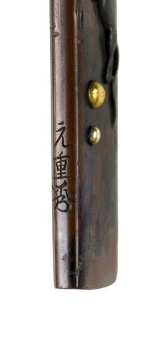Keywords: Motoshige - Kozuka with Daikoku's Hammer - Walters 51633 - Mark A.jpg The hammer in the middle of this kozuka belongs to Daikoku one of the seven gods of good fortune Rats are also associated with Daikoku This design has one rat on either side of the hammer The small round objects at the lower right are sacred jewels Most of Daikoku's attributes are derived from Shinto sources but the sacred jewels come from Buddhism Like the other gods of good fortune Daikoku is a folk god Practices connected to him incorporate teachings from multiple religious traditions The back of the kozuka is decorated with incised lines that resemble cat scratches neko-gake The kozuka is signed on the lower edge date copper with reddish brown patina gold cm 9 8 accession number 51 633 11053 Henry Walters Baltimore date and mode of acqusition unknown Walters Art Museum Henry Walters Acquired by Henry Walters Signature Motoshige place of origin Japan Walters Art Museum license Kozuka in the Walters Art Museum Media contributed by the Walters Art Museum needs category review Motoshige |