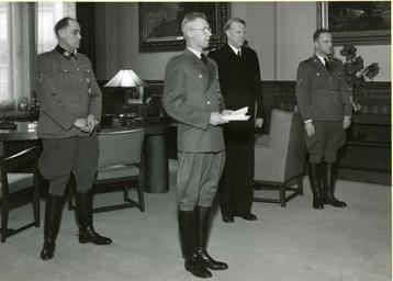 | Keywords: statsakten vidkun quisling vidkunquisling krigen andre verdenskrig andreverdenskrig world war ii worldwarii second world war secondworldwar okkupasjonstiden josef terboven josefterboven people indoor suit Vidkun Quisling og Josef Terboven flankert av tyske offiserer i forbindelse med Statsakten. Fotgraf: NTBs Billed og Klisjeavdeling. Fra album: 1-2-1942. RA/PA-0750/H/0002/ 1017 Vidkun Quisling og Josef Terboven flankert av tyske offiserer i forbindelse med Statsakten. Fotgraf: NTBs Billed og Klisjeavdeling. Fra album: 1-2-1942. RA/PA-0750/H/0002/ 1017 |