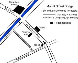 Keywords: Mount Street Bridge, Easter 1916.svg en Plan of British advance and rebel positions around Mount Street Bridge during the Easter Rising in Dublin 1916 own MHz`as 53 20 13 6 N 6 14 22 8 W Easter Rising