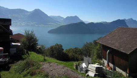 Keywords: mountain farm lake blue green sky agriculture nature rural countryside grass farming natural scenic house ecology pasture switzerland travel hill