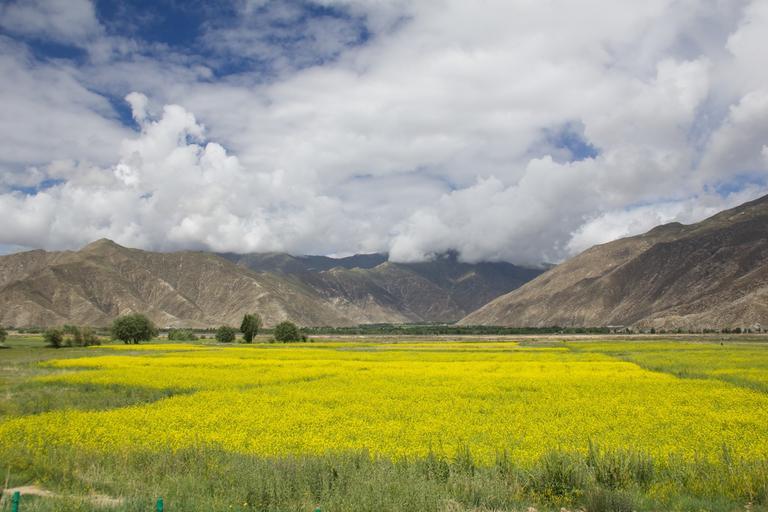 Keywords: mountain field meadow landscape clouds scenic scenery rural nature summer yellow flowers tibet