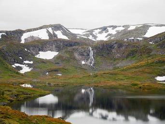 Keywords: mountain lake bergsee norway vision mirroring nature view landscape plateau nordic cold snow waterfall panorama