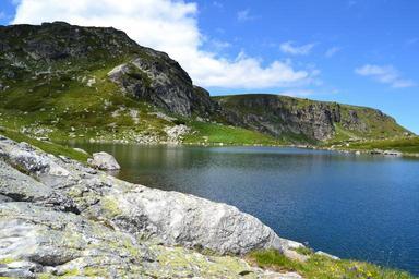 Keywords: mountain lake water rock sky clouds nature outdoor peak green blue