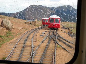 Keywords: mountain train train mountains rainy rails tracks raindrops