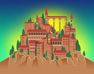 Keywords: mountain village mountain village landscape bright colorful brown blue rural countryside tourism building traditional hill architecture spires rooftops cluster viaduct aqueduct old