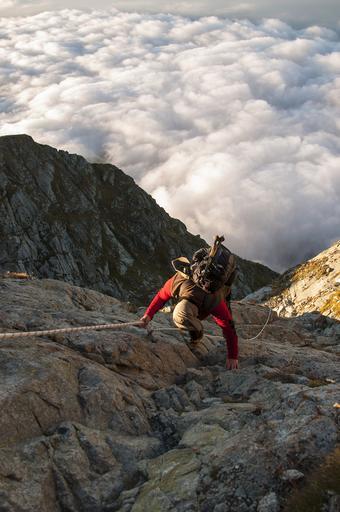 Keywords: mountaineer climb mountain steep rock exposed courageous hike tour risk bergtour sidewalk climber climbing descent alpine bergsport steep wall alpinism hiking nature brackets set abandonment south tyrol wisp light snowfall man lonely