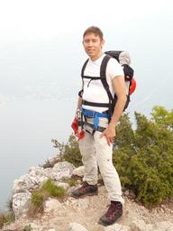 | Keywords: mountaineer wanderer satisfied happy managed man person hiking climbing equipment cima capi senter dei bech via ferrata cima capi garda italy hiking equipment ferrata equipment rucksack belt rope via ferrata klettersteiggurt trained fit no fear of heights courageous abyss |