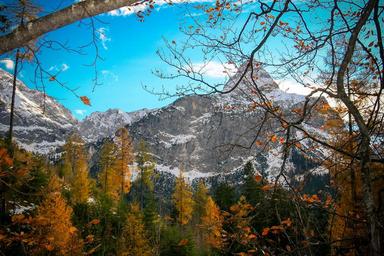 Keywords: mountains autumn leaves landscape alpine zugspitze mountain nature indian summer orange colorful sky blue mountain landscape rock clouds