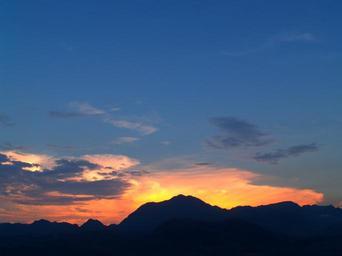 Keywords: mountains cloudy blue sky sunsets sunrises horizons twilight orange lights glow brightly glowing evenings mornings dawn dusk hills high peaks hillside altitudes scenic scenery nature landscapes panoramic panorama