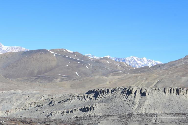 Keywords: mountains dry rock bare lifeless cold desert peaks snowclad landscape blue sky