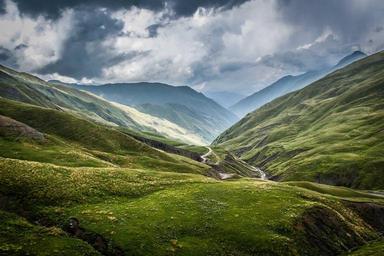 Keywords: mountains green meadow landscape view sky clouds grass travel summer