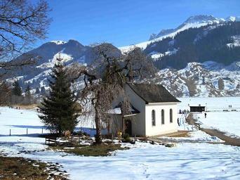 Keywords: mountains mountain landscape nature high mountains hiking chapel faith walk trees switzerland meadow sunny snow winter cold black lake