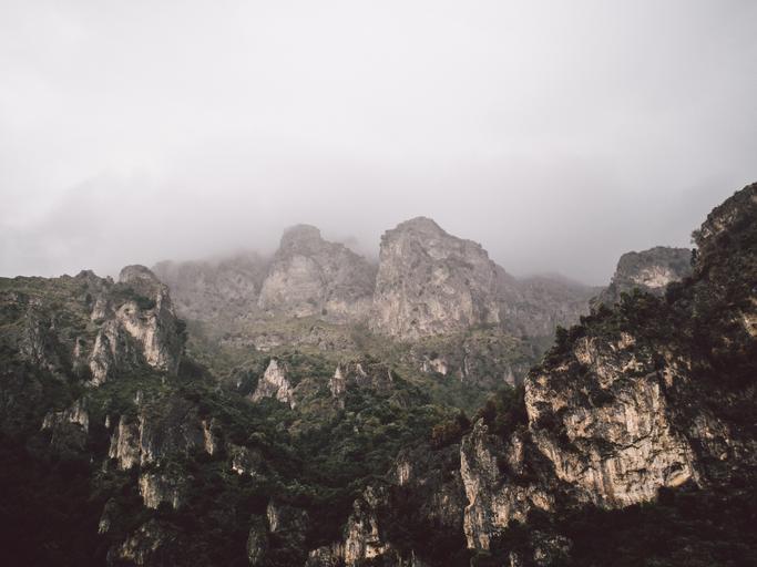 Keywords: mountains rocks steep vegetation fog clouds nature landscape high massive vertical