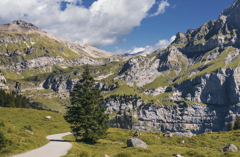 Keywords: mountains trail hiking switzerland lake oeschinen landscape fir mountain range away nature alpine mountain hiking meadow outlook