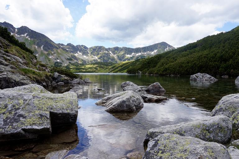 Keywords: mountains the valley of the pond water the stones sky view tatry poland landscape