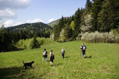 Keywords: mountains view tourism nature spring meadow forests green meadow