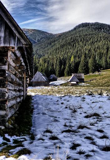 Keywords: mountains wooden houses shepherd's house wooden nature landscape outdoor view village travel cottage hill grass snow scenic season tourism cabin vacation recreation leisure trip tourist recreational adventure trekking expedition