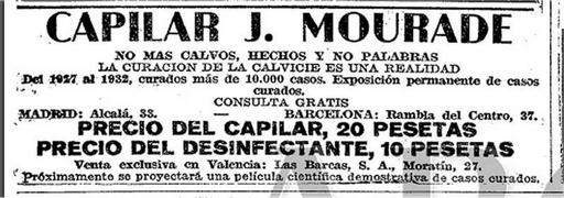 | Keywords: Mourade-J-1934-05-27-capilar-J-Mourade.jpg it Capilar Mourade J inserzione del 27 5 1934 su ABC di Siviglia http //hemeroteca abc es/detalle stm ABC Sevilla 27 5 1934 pag 52 ABC Sevilla 1934-05-27 CAPILAR J MOURADE No mas calvos hechos y no palabras La curacion de la calvicie es una realidad Del 1927 al 1932 curados mas de 10 000 casos Exposicion permanente de casos curados CONSULTA GRATIS MADRID Alcalà 33 --- BARCELONA Rambla del Centro 37 PRECIO DEL CAPILAR 20 PESETAS PRECIO DEL DISINFECTANTE 10 PESETAS Venta exclusiva en Valencia Las Barcas S A Moratin 27 Proximamente se proyectarà una pelicula cientifica demostrativa de casos curados PD-old ImageNote 1 21 21 751 257 798 280 2 CAPILAR J MOURADE No mas calvos hechos y no palabras La curacion de la calvicie es una realidad Del 1927 al 1932 curados mas de 10 000 casos Exposicion permanente de casos curados CONSULTA GRATIS MADRID Alcalà 33 --- BARCELONA Rambla del Centro 37 PRECIO DEL CAPILAR 20 PESETAS PRECIO DEL DISINFECTANTE 10 PESETAS Venta exclusiva en Valencia Las Barcas S A Moratin 27 Proximamente se proyectarà una pelicula cientifica demostrativa de casos curados ImageNoteEnd 1 Capilar Mourade J 1934 1934 advertisements in Spain ABC advertisements ABC Sevilla Capilar Mourade J ABC Sevilla |