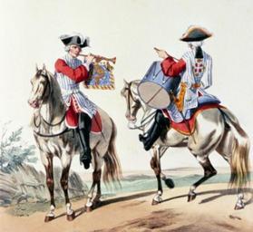 | Keywords: Mousquetaires de la Garde Musician Marbot.jpg Musicians of the Mousquetaires de la Garde in 1724 ˘ left oboeist of the 2nd company ˘ right drummer of the 1st company Marbot Alfred de Tableaux synoptiques de l'infanterie et de la cavalerie françaises et des rĂ©giments Ă©trangers au service de la France de 1720 Ă 1780 Paris ClĂ©ment 1854 detail of plate no 125 1854 Marbot Alfred de PD-old Musketeers of the Guard Military uniforms of France Musketeers in art King Louis XV of France army 1715-1774 |