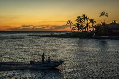 Keywords: moving boat sunset seascape orange sky water ocean landscape nature summer travel evening scenic clouds sky palm trees tropical outdoor colorful scenery dramatic view