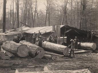 | Keywords: lumber industry lumberindustry outdoor monochrome Photographer: Reuben R. Sallows (1855 - 1937) Description: Two teams of horses and eight men posed in front of lean-to shed in wooded area; three logs, with bark, in foreground; four large logs, without bark, in middle-ground; a team of horses on left behind logs; two men standing on log at extreme right; other men posed around and on top of logs; most men wearing hats, shirts; and pants with suspenders, or bibbed overalls; date (1911/17) in pencil and Sallows stamp in blue ink on back Object ID : 0363-rrs-ogohc-ph View additional photographs by Sallows that are held in other collections at the Reuben R. Sallows Digital Library. Order a higher-quality version of this item by contacting the Huron County Museum (fee applies). Photographer: Reuben R. Sallows (1855 - 1937) Description: Two teams of horses and eight men posed in front of lean-to shed in wooded area; three logs, with bark, in foreground; four large logs, without bark, in middle-ground; a team of horses on left behind logs; two men standing on log at extreme right; other men posed around and on top of logs; most men wearing hats, shirts; and pants with suspenders, or bibbed overalls; date (1911/17) in pencil and Sallows stamp in blue ink on back Object ID : 0363-rrs-ogohc-ph View additional photographs by Sallows that are held in other collections at the Reuben R. Sallows Digital Library. Order a higher-quality version of this item by contacting the Huron County Museum (fee applies). |