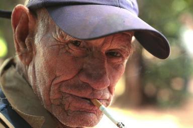 Keywords: mr wholesale cap smoker cigar veteran portrait documentary blue green smoke man hat paraguay look looking at camera face gender world brasa nicotine tobacco jungle