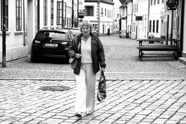 Keywords: mrs lady street black and white black tower českě české budějovice paving city weekday woman city center south bohemia movement contrast czech budejovice autumn black white