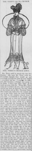 | Keywords: Mrs Terry's Church Gown.jpg Togtown wore his best clothes ” everybody but me I wouldn't do different just because a stranger was going to be there I don't care what they do as much as some folks do When Mrs Terry came in I couldn't see her and I wouldn't stretch my neck at anybody the way some of the women did at Mrs Theodore Terry But I went out right after the sermon and was in the lobby when she went through She had on the simplest church dress I ever saw I wondered if the women who had togged out so were not ashamed The dress she wore was a tan-colored W Camel hair camelshair made up with velvet of a deeper shade Around the bottom of the skirt was a series of velvet medallions set under the goods and several rows of stitching made a pretty trimming around the medallions The Eton jacket was of camelshair with a fitted band of the same stitched all around the edge The over-sleeve was fitted in as if it were apart of the Eton; the effect was almost like a deep collar clothing collar_styles bertha The bodice was of the deeper shaded velvet; a crushed fitted velvet belt was fastened blindly at one side The skirt was shirring shirred neatly just below the belt The sleeves of velvet fell in soft folds and I knew that Mrs Terry was wearing one of the new cool lightweight velvets Her hat was of scarlet roses the petals shading to a dainty rose pink There wasn't anything but flowers on the hat It was her Easter bonnet And the chiffon fabric chiffon bow under her chin was rose pink too just the color of the rose color in the hat and her gloves were the color of her gown Martha told me afterward that she caught sight of something embroidered in tan-colored silk on the left cuff She said it made her think of the little bit of red she saw on Mrs Terry's raincoat collar I didn't see that I wonder what it is ” a Coat of arms coat-of-arms maybe 1904-04-07 http //chroniclingamerica loc gov/lccn/sn88085187/1904-04-07/ed-1/seq-2/ The Tacoma Times author other versions PD-old-70-1923 Uploaded with UploadWizard Women's clothing Fashion in 1904 Images from The Tacoma Times |