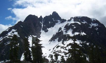 Keywords: Mt Septimus.png en Mount Septimus NW aspect Photo taken from near Cream Lake The thin line of vertical snow in the middle of the picture is the standard route to the summit It is often refered to as the X-gullies Own Fraser harris 2006-07-15 Vancouver Island Ranges Strathcona Provincial Park