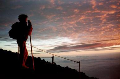 Keywords: MtFujiSunrise.jpg Sunrise near the summit of Mt Fuji own 1996-08-03 Mark Grant Released to public domain Climbing Mount Fuji